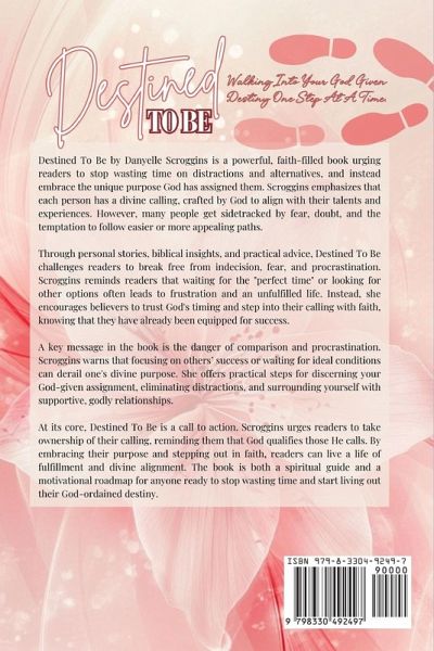 Destined To Be by Danyelle Scroggins is a powerful, faith-filled book that urges readers to stop wasting time on distractions and alternatives and instead embrace the unique purpose God has assigned them. Scroggins emphasizes that each person has a divine calling crafted by God to align with their talents and experiences. However, many people get sidetracked by fear, doubt, and the temptation to follow more accessible or appealing paths. Through personal stories, biblical insights, and practical advice, Destined To Be challenges readers to break free from indecision, fear, and procrastination. Scroggins reminds readers that waiting for the "perfect time" or looking for other options often leads to frustration and an unfulfilled life. Instead, she encourages believers to trust God's timing and step into their calling with faith, knowing they have already been equipped for success. A key message in the book is the danger of comparison and procrastination. Scroggins warns that focusing on others' success or waiting for ideal conditions can derail one's divine purpose. She offers practical steps for discerning your God-given assignment, eliminating distractions, and surrounding yourself with supportive, godly relationships. At its core, Destined To Be is a call to action. Scroggins urges readers to take ownership of their calling, reminding them that God qualifies those He calls. By embracing their purpose and stepping out in faith, readers can live a life of fulfillment and divine alignment. The book is a spiritual guide and a motivational roadmap for anyone ready to stop wasting time and start living out their God-ordained destiny.