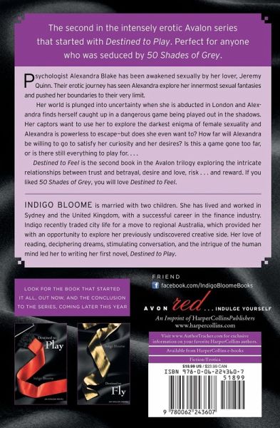 The second in the intensely erotic Avalon seriesthat started with Destined to Play. Perfect for anyone who was seduced by 50 Shades of Grey. Psychologist Alexandra Blake has been awakened sexually by her lover, Jeremy Quinn. Their erotic journey has seen Alexandra explore her innermost sexual fantasies and pushed her boundaries to their very limit. Her world is plunged into uncertainty when she is abducted in London and Alexandra finds herself caught up in a dangerous game being played out in the shadows. Her captors want to use her to explore the darkest enigma of female sexuality and Alexandra is powerless to escape?but does she even want to? How far will Alexandra be willing to go to satisfy her curiosity and her desires? Is this a game gone too far, or is there still everything to play for. . . . Destined to Feel is the second book in the Avalon trilogy exploring the intricate relationships between trust and betrayal, desire and love, risk . . . and reward. If you liked 50 Shades of Grey, you will love Destined to Feel.