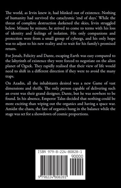 The world, as Irvin knew it, had blinked out of existence. Nothing of humanity had survived the cataclysmic 'end of days.' While the threat of complete destruction darkened the skies, Irvin struggled below. Minute by minute, he strived to come to terms with his loss of identity and feelings of isolation. His only companions and protection were from a small group of cyborgs, and his only hope was to adjust to his new reality and to wait for his family's promised return. For Jonah, Felicity and Dante, escaping Earth was easy compared to the labyrinth of existence they were forced to negotiate on the alien planet of Ogzek. They rapidly realised that their view of life would need to shift in a different direction if they were to avoid the many traps. On Azadin, all the inhabitants desired was a new Game of vast dimensions and thrills. The only person capable of delivering such an event was their grand designer, Dante, but he was nowhere to be found. In his absence, Emperor Talus decided that nothing could be more exciting than wiping out the organics and having a space war. Amidst the chaos, the fate of organics hung in the balance while the stage was set for a showdown of cosmic proportions.