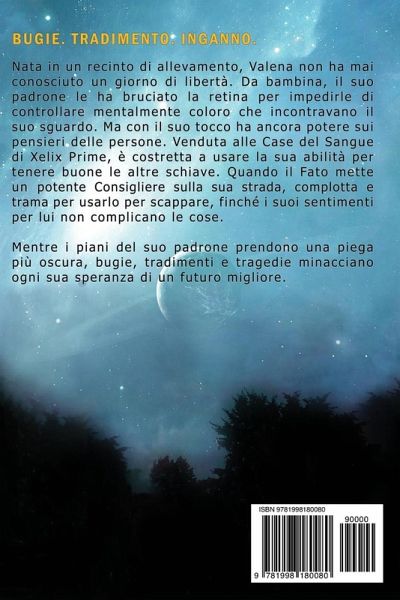 Bugie. Tradimento. Inganno. Nata in un recinto di allevamento, Valena non ha mai conosciuto un giorno di libertà. Da bambina, il suo padrone le ha bruciato la retina per impedirle di controllare mentalmente coloro che incontravano il suo sguardo. Ma con il suo tocco ha ancora potere sui pensieri delle persone. Venduta alle Case del Sangue di Xelix Prime, è costretta a usare la sua abilità per tenere buone le altre schiave. Quando il Fato mette un potente Consigliere sulla sua strada, complotta e trama per usarlo per scappare, finché i suoi sentimenti per lui non complicano le cose. Mentre i piani del suo padrone prendono una piega più oscura, bugie, tradimenti e tragedie minacciano ogni sua speranza di un futuro migliore.