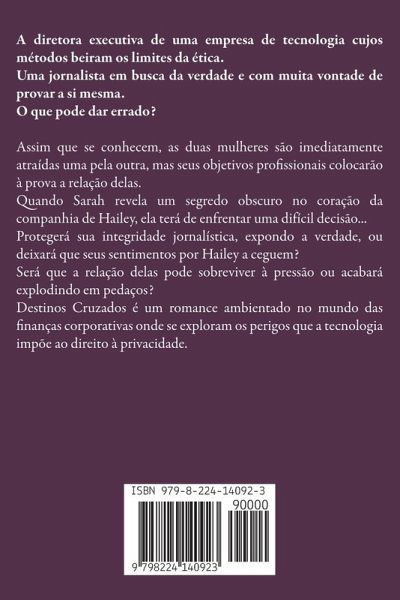 A diretora executiva de uma empresa de tecnologia cujos métodos beiram os limites da ética. Uma jornalista em busca da verdade e com muita vontade de provar a si mesma. O que pode dar errado? Assim que se conhecem, as duas mulheres são imediatamente atraídas uma pela outra, mas seus objetivos profissionais colocarão à prova a relação delas. Quando Sarah revela um segredo obscuro no coração da companhia de Hailey, ela terá de enfrentar uma difícil decisão... Protegerá sua integridade jornalística, expondo a verdade, ou deixará que seus sentimentos por Hailey a ceguem? Será que a relação delas pode sobreviver à pressão ou acabará explodindo em pedaços? Destinos Cruzados é um romance ambientado no mundo das finanças corporativas onde se exploram os perigos que a tecnologia impõe ao direito à privacidade.