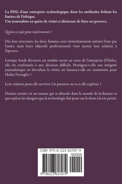 La PDG d'une entreprise technologique dont les méthodes frôlent les limites de l'éthique. Une journaliste en quête de vérité et désireuse de faire ses preuves. Qu'est-ce qui peut mal tourner ? Dès leur rencontre, les deux femmes sont immédiatement attirées l'une par l'autre, mais leurs objectifs professionnels vont mettre leur relation à l'épreuve. Lorsque Sarah découvre un sombre secret au cœur de l'entreprise d'Hailey, elle est confrontée à une décision difficile. Protégera-t-elle son intégrité journalistique en dévoilant la vérité, ou laissera-t-elle ses sentiments pour Hailey l'aveugler ? Leur relation peut-elle survivre à la pression ou va-t-elle exploser ? Destins croisés est un roman qui se déroule dans le monde de la finance et qui explore les dangers que la technologie fait peser sur le droit à la vie privée.
