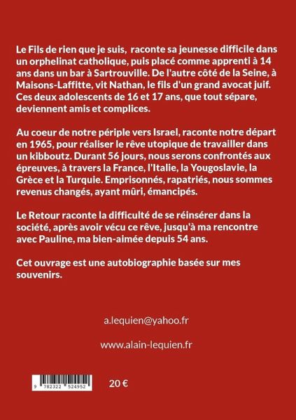 Le Fils de rien raconte ma jeunesse difficile dans un orphelinat catholique, puis placé comme apprenti à 14 ans dans un bar à Sartrouville. De l'autre côté de la Seine, à Maisons-Laffitte, vit Nathan, le fils d'un grand avocat juif. Ces deux adolescents de 16 et 17 ans, que tout sépare, deviennent amis et complices.Au coeur de notre périple vers Israel, raconte notre départ en 1965, pour réaliser le rêve utopique de travailler dans un kibboutz. Durant 56 jours, nous serons confrontés aux épreuves, à travers la France, l'Italie, la Yougoslavie, la Grèce et la Turquie. Emprisonnés, rapatriés, nous sommes revenus changés, ayant mûri, émancipés.Le Retour raconte la difficulté de se réinsérer dans la société, après avoir vécu ce rêve, jusqu'à ma rencontre avec Pauline, ma bien-aimée depuis 54 ans.Cet ouvrage est une autobiographie basée sur mes souvenirs.