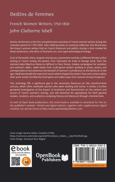 Destins de femmes is the first comprehensive overview of French women writers during the turbulent period of 1750-1850. John Isbell provides an essential collection that illuminates the impact women writers had on French literature and politics during a time marked by three revolutions, the influx of Romantic art, and rapid technological change. Each of the book's thirty chapters introduces a prominent work by a different female author writing in French during the period, from Germaine de Staël to George Sand, from the admired salon libertine Marie du Deffand to Flora Tristan, tireless campaigner for socialism and women's rights. Isbell draws from multi-genre writers working in prose, poetry and correspondence and addresses the breadth of women's contribution to the literature of the age. Isbell also details the important events which shaped the writers' lives and contextualises their work amidst the liberties both given and taken away from women during the period. This anthology fills a significant gap in the secondary literature on this transformative century, which often overlooks women who were working and active. It invites a further gendered investigation of the impact of revolution and Romanticism on the content and nature of French women's writing, and will therefore be appropriate for both general readers, students, and academics analysing history and literature through a feminist lens.