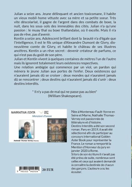 Julian a seize ans. Jeune délinquant et ancien toxicomane, il habite un vieux mobil-home vétuste avec sa mère et sa petite soeur. Très vite déscolarisé, il gagne de l'argent dans des combats de boxe, la nuit, dans les sous-sols des immeubles des cités. Julian n'a qu'une passion : le muay thaï ou boxe thaïlandaise, où il excelle. Mais il n'a pas de rêve, pas d'avenir.Kentin a seize ans. Adolescent brillant dont la beauté n'a d'égale que l'intelligence, il est le fils unique d'Alexandre Dumont de Givry, dix-neuvième comte de Givry, et habite le château de ses illustres ancêtres. Kentin a un rêve secret : devenir créateur de parfums, ce qui n'est pas du goût de son père.Julian et Kentin vivent à quelques centaines de mètres l'un de l'autre mais ils ignorent totalement leurs existences respectives.Une relation ambigüe qui commence par un viol, un pardon qui mènera le jeune Julian aux portes de l'enfer. Deux existences qui n'auraient jamais dû se croiser ; deux mondes qui n'auraient jamais dû se rencontrer ; deux destins qui n'auraient jamais dû s'unir : deux destins interdits." Il n'y a pas de mal qui ne passe pas au bien" (William Shakespeare).