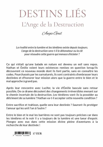 La rivalité entre la lumière et les ténèbres existe depuis toujours. L'ange de la destruction sera-t-il le détonateur ou la clé pour résoudre cette guerre qui menace d'éclater ?Ce qui n'était qu'une balade en nature est devenu un exil sans repos. Nathan et Émilie voient leurs existences remises en question lorsqu'ils découvrent ce nouveau monde dont ils font partie, sans en connaître les codes. Pourchassés par les surnaturels, ils sont contraints d'embrasser leurs destinées et d'honorer leur mission alors que la guerre entre le bien et le mal approche à grand pas.Après leur rencontre avec Lucifer, la vie d'Émilie bascule sans retour possible. De ce drame découlent des changements irréversibles menant sur le chemin incertain de la destruction. Les ténèbres vont-ils la posséder au détriment de sa lumière ? Nathan va-t-il accepter cette nouvelle condition ? Entre sacrifice et trahison, quelle sera leur destinée ? Sauront-ils protéger l'amour qui les unit l'un à l'autre ? Entre le bien et le mal les barrières ne sont pas toujours précises car dans les ténèbres et le noir il y a toujours de la lumière et une lueur d'espoir. Plongez avec eux dans cette mission divine pleine d'aventures à la recherche de leur destinée !