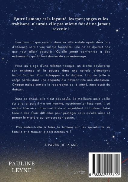 Entre l'amour et la loyauté, les mensonges et les trahisons, n'aurait-elle pas mieux fait de ne jamais revenir ? Lina pensait que revenir dans sa ville natale après deux ans d'absence serait une simple formalité. Elle ne se doutait pas que tout allait basculer. Qu'elle serait confrontée à des événements qui la font douter de son entourage. Prise au piège d'une relation toxique, un drame bouleverse son existence et la pousse dans une spirale d'émotions incontrôlables. Pour échapper à la douleur, Lina se jette à corps perdu dans une enquête qui devient vite une obsession. Chaque indice semble la rapprocher de la vérité, mais aussi du danger. Dans ce chaos, elle n'est pas seule. Sa meilleure amie veille sur elle, et puis il y a cet homme, mystérieux et fascinant. Il se révèle être un soutien inattendu et envoûtant. Lina devra faire face à des choix difficiles pour protéger ceux qu'elle aime et percer le mystère qui entoure son destin. Parviendra-t-elle à faire la lumière sur les secrets de sa famille et à trouver la paix intérieure ?