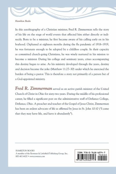 Fred R. Zimmerman served as an active parish minister of the United Church of Christ in Ohio for sixty-two years. During the middle of his professional career, he filled a significant post on the administrative staff of Defiance College, Defiance, Ohio. A preacher and teacher of the Gospel of Jesus Christ, Zimmerman has been an ardent advocate of life as affirmed by Jesus in St. John 10:10 ("I came that they may have life, and have it abundantly").