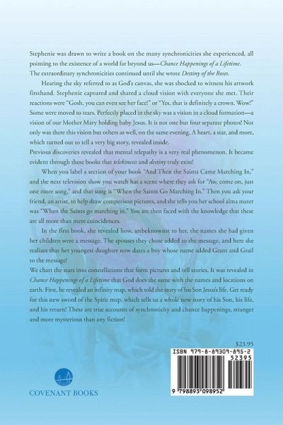 Stephenie was drawn to write a book on the many synchronicities she experienced, all pointing to the existence of a world far beyond us-Chance Happenings of a Lifetime. The extraordinary synchronicities continued until she wrote Destiny of the Roses. Hearing the sky referred to as God's canvas, she was shocked to witness his artwork firsthand. Stephenie captured and shared a cloud vision with everyone she met. Their reactions were "Gosh, you can even see her face!" or "Yes, that is definitely a crown. Wow!" Some were moved to tears. Perfectly placed in the sky was a vision in a cloud formation-a vision of our Mother Mary holding baby Jesus. It is not one but four separate photos! Not only was there this vision but others as well, on the same evening. A heart, a star, and more, which turned out to tell a very big story, revealed inside. Previous discoveries revealed that mental telepathy is a very real phenomenon. It became evident through these books that telekinesis and destiny truly exist! When you label a section of your book "And Then the Saints Came Marching In," and the next television show you watch has a scene where they ask for "Aw, come on, just one more song," and that song is "When the Saints Go Marching In." Then you ask your friend, an artist, to help draw comparison pictures, and she tells you her school alma mater was "When the Saints go marching in." You are then faced with the knowledge that these are all more than mere coincidences. In the first book, she revealed how, unbeknownst to her, the names she had given her children were a message. The spouses they chose added to the message, and here she realizes that her youngest daughter now dates a boy whose name added Grant and Grail to the message! We chart the stars into constellations that form pictures and tell stories. It was revealed in Chance Happenings of a Lifetime that God does the same with the names and locations on earth. First, he revealed an infinity map, which told the story of his Son Jesus's life. Get ready for this new sword of the Spirit map, which tells us a whole new story of his Son, his life, and his return! These are true accounts of synchronicity and chance happenings, stranger and more mysterious than any fiction!
