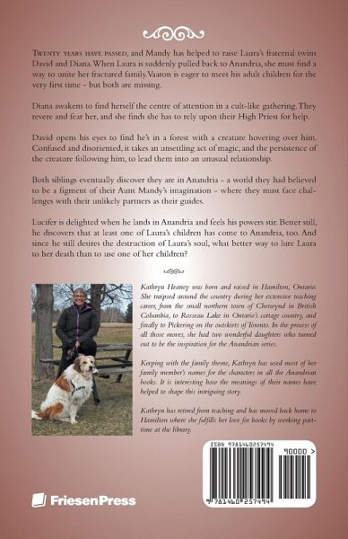 Twenty years have passed, and Mandy has helped to raise Laura's fraternal twins David and Diana. When Laura is suddenly pulled back to Anandria, she must find a way to unite her fractured family. Vaaron is eager to meet his adult children for the very first time - but both are missing. Diana awakens to find herself the centre of attention in a cult-like gathering. They revere and fear her, and she finds she has to rely upon their High Priest for help. David opens his eyes to find he's in a forest with a creature hovering over him. Confused and disoriented, it takes an unsettling act of magic, and the persistence of the creature following him, to lead them into an unusual relationship. Both siblings eventually discover they are in Anandria - a world they had believed to be a figment of their Aunt Mandy's imagination - where they must face challenges with their unlikely partners as their guides. Lucifer is delighted when he lands in Anandria and feels his powers stir. Better still, he discovers that at least one of Laura's children has come to Anandria, too. And since he still desires the destruction of Laura's soul, what better way to lure Laura to her death than to use one of her children?