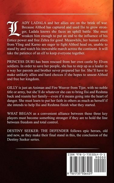 LADY LADALA and her allies are on the brink of war. Because Althod has captured and used Ilsi to grow stronger Ladala knows she faces an uphill battle. She must weaken him enough to put an end to the influence of his Entice power and free Zehra for good. Meanwhile, her human allies from Yling and Karno are eager to fight Althod head on, unable to stand by and watch his inexorable march across the continent. It will take the patience of an elf to keep everyone together.¿ ¿ PRINCESS DURI has been rescued from her own castle by Elven soldiers. In order to save her people, she has to step up as a leader in a way her parents and brother never prepared her for. She'll have to make unlikely allies and hard choices if she hopes to unseat Althod and free her kingdom.¿¿ GILLY is just an Animan and Fire Weaver from Tijer, with no noble title or army, but she'll do whatever she can to bring Ilsi and Reshma back and reunite her family-even if it means going into the heart of danger. She must learn to put her faith in others as much as herself if she intends to help Ilsi and Reshma finish what they started.¿¿ WHAT BEGAN as a conventional alliance between these three key players must become something stronger if they are to hold the line between freedom and total control.¿¿ DESTINY SEEKER: THE DEFENDER follows epic heroes, old and new, as they make their final stand in this, the conclusion of the Destiny Seeker series.¿