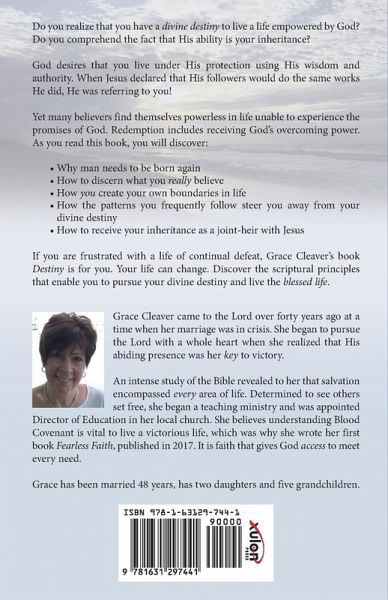 Do you realize that you have a divine destiny to live a life empowered by God? Do you comprehend the fact that His ability is your inheritance? God desires that you live under His protection using His wisdom and authority. When Jesus declared that His followers would do the same works He did, He was referring to you! Yet many believers find themselves powerless in life unable to experience the promises of God. Redemption includes receiving God's overcoming power. As you read this book, you will discover: - Why man needs to be born again - How to discern what you really believe - How you create your own boundaries in life - How the patterns you frequently follow steer you away from your divine destiny - How to receive your inheritance as a joint-heir with Jesus If you are frustrated with a life of continual defeat, Grace Cleaver's book Destiny is for you. Your life can change. Discover the scriptural principles that enable you to pursue your divine destiny and live the blessed life. Grace Cleaver came to the Lord over forty years ago at a time when her marriage was in crisis. She began to pursue the Lord with a whole heart when she realized that His abiding presence was her key to victory. An intense study of the Bible revealed to her that salvation encompassed every area of life. Determined to see others set free, she began a teaching ministry and was appointed Director of Education in her local church. She believes understanding Blood Covenant is vital to live a victorious life, which was why she wrote her first book Fearless Faith, published in 2017. It is faith that gives God access to meet every need. Grace has been married 48 years, has two daughters and five grandchildren.