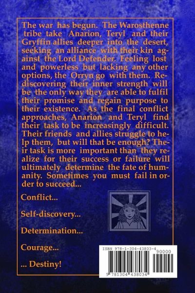 The war has begun. The Warosthenne tribe take Anarion, Teryl and their Gryffin allies deeper into the desert, seeking an alliance with their kin against the Lord Defender. Feeling lost and powerless but lacking any other options, the Orryn go with them. Rediscovering their inner strength will be the only way they are able to fullfil their promise and regain purpose to their existence. As the final conflict approaches, Anarion and Teryl find their task to be increasingly difficult. Their friends and allies struggle to help them, but will that be enough? Their task is more important than they realize for their success or failure will ultimately determine the fate of humanity. Sometimes you have to fail in order to succeed.