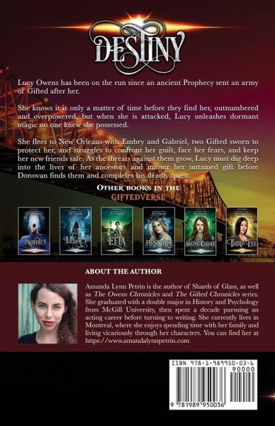 I waited for the blow, but it didn't come. There was a gust of wind and a loud bang, then nothing but a faint ringing in my ears and tingling in my palms. When I opened my eyes, the woman was gone... After making a shocking discovery about herself, Lucy must embrace her destiny or follow in the tragic footsteps of the women who came before her. Lucy Owens was your average eighteen-year-old with overprotective guardians until an ancient Prophecy sent an army of Gifteds (humans with supernatural abilities) after her.Still haunted by her last encounter with Donovan's Army, Lucy is looking forward to putting the past few months behind her and preparing herself to eventually face the Big Bad. When Donovan and his followers have other plans, Lucy barely escapes with her life, until she discovers something about herself that changes everything.After Embry and Gabriel, the men sworn to protect her, whisk Lucy away to New Orleans, she is left with more questions than answers. There, Lucy must confront her guilt, face her fears and dig deep into the lives of her ancestors in order to master her newfound skills. Hopefully before the Big Bad finds her and completes his centuries-long quest. Destiny is the second novel in a coming of age paranormal trilogy by Amanda Lynn Petrin. If you like strong and vulnerable heroines who keep fighting no matter how many times they are knocked down, then you'll love this supernatural adventure.
