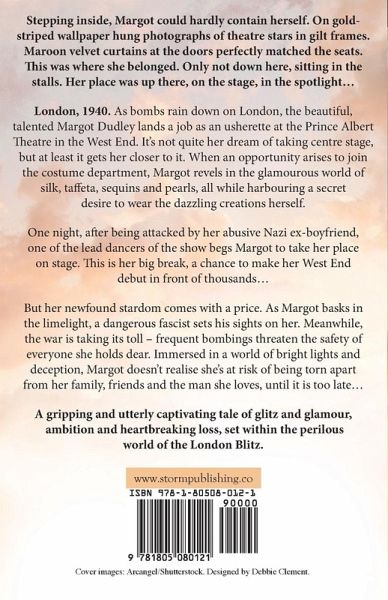 Stepping inside, Margot could hardly contain herself. On gold striped wallpaper hung photographs of theatre stars in gilt frames. Maroon velvet curtains at the doors perfectly matched the seats. This was where she belonged. Only not down here, sitting in the stalls. Her place was up there, on the stage, in the spotlight... London, 1940. As bombs rain down on London, the beautiful, talented Margot Dudley lands a job as an usherette at the Prince Albert Theatre in the West End. It's not quite her dream of taking centre stage, but at least it gets her closer to it. When an opportunity arises to join the costume department, Margot revels in the glamourous world of silk, taffeta, sequins and pearls, all while harbouring a secret desire to wear the dazzling creations herself. One night, after being attacked by her abusive Nazi ex-boyfriend, one of the lead dancers of the show begs Margot to take her place on stage. This is her big break, a chance to make her West End debut in front of thousands... But her newfound stardom comes with a price. As Margot basks in the limelight, a dangerous fascist sets his sights on her. Meanwhile, the war is taking its toll - frequent bombings threaten the safety of everyone she holds dear. Immersed in a world of bright lights and deception, Margot doesn't realise she's at risk of being torn apart from her family, friends and the man she loves, until it is too late... A gripping and utterly captivating tale of glitz and glamour, ambition and heartbreaking loss, set within the perilous world of the London Blitz.