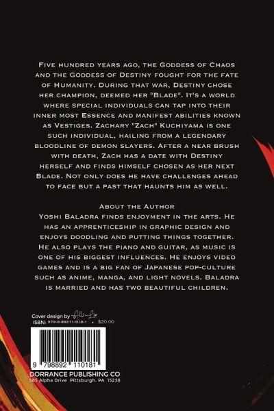 Five hundred years ago, the Goddess of Chaos and the Goddess of Destiny fought for the fate of Humanity. During that war, Destiny chose her champion, deemed her "Blade". It's a world where special individuals can tap into their inner most Essence and manifest abilities known as Vestiges. Zachary "Zach" Kuchiyama is one such individual, hailing from a legendary bloodline of demon slayers. After a near brush with death, Zach has a date with Destiny herself and finds himself chosen as her next Blade. Not only does he have challenges ahead to face but a past that haunts him as well. About the Author Yoshi Baladra finds enjoyment in the arts. He has an apprenticeship in graphic design and enjoys doodling and putting things together. He also plays the piano and guitar, as music is one of his biggest influences. He enjoys video games and is a big fan of Japanese pop-culture such as anime, manga, and light novels. Baladra is married and has two beautiful children.