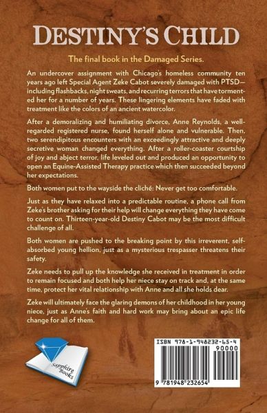 An undercover assignment with Chicago's homeless community ten years ago left Special Agent Zeke Cabot severely damaged with PTSD-including flashbacks, night sweats, and recurring terrors that have tormented her for a number of years. These lingering elements have faded with treatment like the colors of an ancient watercolor. After a demoralizing and humiliating divorce, Anne Reynolds, a well-regarded registered nurse, found herself alone and vulnerable. Then, two serendipitous encounters with an exceedingly attractive and deeply secretive woman changed everything. After a roller-coaster courtship of joy and abject terror, life leveled out and produced an opportunity to open an Equine-Assisted Therapy practice which then succeeded beyond her expectations. Both women put to the wayside the cliché: Never get too comfortable. Just as they have relaxed into a predictable routine, a phone call from Zeke's brother asking for their help will change everything they have come to count on. Thirteen-year-old Destiny Cabot may be the most difficult challenge of all. Both women are pushed to the breaking point by this irreverent, self-absorbed young hellion, just as a mysterious trespasser threatens their safety. Zeke needs to pull up the knowledge she received in treatment in order to remain focused and both help her niece stay on track and, at the same time, protect her vital relationship with Anne and all she holds dear. Zeke will ultimately face the glaring demons of her childhood in her young niece, just as Anne's faith and hard work may bring about an epic life change for all of them.