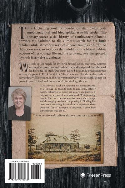 We took up the search for my birth families when, over time, systemic interruptions, governmental budget cuts, and antiquated laws slammed the door once too often. Our search evolved into a truly amazing journey! Among the pages in Part One will be "ah-ha" moments for the reader, as these very ordinary folk recount, in their very personal ways, the colourful goings-on around them, of local and international historical significance. "Creativity is as much a pleasure for me, as it is cathartic. It is enjoyed in pursuits such as gardening, interior design, culinary arts, music, art history, and puzzles. It originates as a result of a curious mind. While tutoring later in life, my creativity was able to erase teen angst and the nagging doubts accompanying it. Nothing has been more rewarding for me than to experience those wonderful 'ah-ha' moments of discovery. I know how extraordinary they can be." The author fervently believes that everyone has a story to tell.