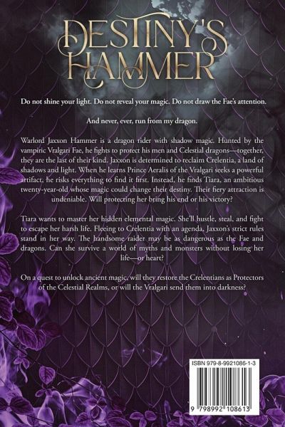 Do not shine your light. Do not reveal your magic. Do not draw the Fae's attention. And never, ever, run from my dragon. Warlord Jaxxon Hammer is a dragon rider with shadow magic. Hunted by the vampiric Vralgari Fae, he fights to protect his men and Celestial dragons-together, they are the last of their kind. Jaxxon is determined to reclaim Crelentia, a land of shadows and light. When he learns Prince Aeralis of the Vralgari seeks a powerful artifact, he risks everything to find it first. Instead, he finds Tiara, an ambitious twenty-year-old whose magic could change their destiny. Their fiery attraction is undeniable. Will protecting her bring his end or his victory? Tiara wants to master her hidden elemental magic. She'll hustle, steal, and fight to escape her harsh life. Fleeing to Crelentia with an agenda, Jaxxon's strict rules stand in her way. The handsome raider may be as dangerous as the Fae and dragons. Can she survive a world of myths and monsters without losing her life-or heart? On a quest to unlock ancient magic, will they restore the Crelentians as Protectors of the Celestial Realms, or will the Vralgari send them into darkness? Destiny's Hammer is the first book in the Celestial Dragon Riders Series by T. L. Price, an epic romantic fantasy adventure filled with battles, dragons, and spicy, heart-wrenching romance. Perfect for fans of Fourth Wing, When the Moon Hatched, Quicksilver, and A Court of Thorns and Roses.