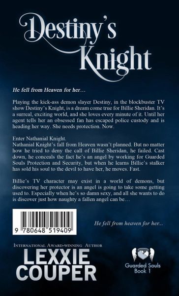 He fell from Heaven for her… Playing the kick-ass demon slayer, Destiny, in the blockbuster TV show Destiny's Knight is a dream come true for Billie Sheridan. It's a surreal, exciting world and she loves every minute of it. Until her agent tells her an obsessed fan has escaped police custody and is heading her way. She needs protection. Now. Enter Nathanial Knight. Nathanial Knight's fall from heaven wasn't planned. But no matter how he tried to deny the call of Billie Sheridan, he failed. Cast down, he conceals the fact he's an angel by working for Guarded Souls Protection and Security, but when he learns that Billie's stalker has sold his soul to the devil to have her, he moves. Fast. Billie's character may exist in a world of demons, but discovering her protector is an angel is going to take some getting used to. Especially when he's so damn sexy, and all she wants to do is discover just how naughty a fallen angel can be…