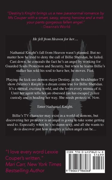 He fell from Heaven for her... Playing the kick-ass demon slayer Destiny, in the blockbuster TV show Destiny's Knight, is a dream come true for Billie Sheridan. It's a surreal, exciting world, and she loves every minute of it. Until her agent tells her an obsessed fan has escaped police custody and is heading her way. She needs protection. Now. Enter Nathanial Knight. Nathanial Knight's fall from Heaven wasn't planned. But no matter how he tried to deny the call of Billie Sheridan, he failed. Cast down, he conceals the fact he's an angel by working for Guarded Souls Protection and Security, but when he learns Billie's stalker has sold his soul to have her, he moves. Fast. Billie's TV character may exist in a world of demons, but discovering her protector is an angel is going to take some getting used to. Especially when he's so damn sexy, and all she wants to do is discover just how naughty a fallen angel can be... "...a smart, sassy, strong heroine and a melt your pants gorgeous fallen angel. Billie will have you rallying to her side and you'll want Nath for your next book boyfriend." - Deanna's World Reviews