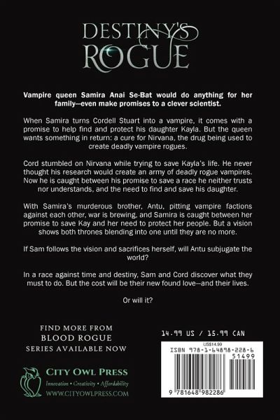 Vampire queen Samira Anai Se-Bat would do anything for her family-even make promises to a clever scientist. When Samira turns Cordell Stuart into a vampire, it comes with a promise to help find and protect his daughter Kayla. But the queen wants something in return: a cure for Nirvana, the drug being used to create deadly vampire rogues. Cord stumbled on Nirvana while trying to save Kayla's life. He never thought his research would create an army of deadly rogue vampires. Now he is caught between his promise to save a race he neither trusts nor understands, and the need to find and save his daughter. With Samira's murderous brother, Antu, pitting vampire factions against each other, war is brewing, and Samira is caught between her promise to save Kay and her need to protect her people. But a vision shows both thrones blending into one until they are no more. If Sam follows the vision and sacrifices herself, will Antu subjugate the world? In a race against time and destiny, Sam and Cord discover what they must to do. But the cost will be their new found love-and their lives. Or will it?