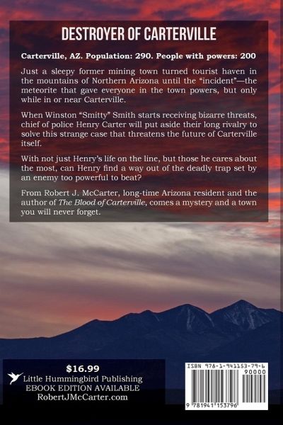 Carterville, AZ. Population: 290. People with powers: 200 Just a sleepy former mining town turned tourist haven in the mountains of Northern Arizona until the "incident"-the meteorite that gave everyone in the town powers, but only while in or near Carterville. When Winston "Smitty" Smith starts receiving bizarre threats, chief of police Henry Carter will put aside their long rivalry to solve this strange case that threatens the future of Carterville itself. With not just Henry's life on the line, but those he cares about the most, can Henry find a way out of the deadly trap set by an enemy too powerful to beat? From Robert J. McCarter, long-time Arizona resident and the author of The Blood of Carterville, comes a mystery and a town you will never forget.
