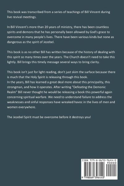 This book was transcribed from a series of teachings of Bill Vincent during live revival meetings. In Bill Vincent's more than 20 years of ministry, there has been countless spirits and demons that he has personally been allowed by God's grace to overcome in many people's lives. There have been various kinds but none as dangerous as the spirit of Jezebel. This book is as no other Bill has written because of the history of dealing with this spirit so many times over the years. The Church doesn't need to take this lightly. Bill brings this timely message several ways to bring clarity. This book isn't just for light reading, don't just skim the surface because there is much that the Holy Spirit is releasing through this book. In the years, Bill has learned a great deal more about this principality, this strongman, and how it operates. After writing "Defeating the Demonic Realm" Bill never thought he would be releasing a book this powerful again concerning spiritual warfare. We need to understand failure to address the weaknesses and sinful responses have wreaked havoc in the lives of men and women everywhere. The Jezebel Spirit must be overcome before it destroys you!
