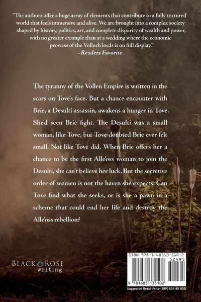 "Tove is an incredibly charismatic character who is a joy to follow through her trials and tribulations and the romance that builds between her and another Desulti is one of the sweetest and most natural relationship that I have read in recent years." -Reedsy Discovery The tyranny of the Vollen Empire is written in the scars on Tove's face. But a chance encounter with Brie, a Desulti assassin, awakens a hunger in Tove. She'd seen Brie fight. The Desulti was a small woman, like Tove, but Tove doubted Brie ever felt small. Not like Tove did. When Brie offers her a chance to be the first Alle'oss woman to join the Desulti, she can't believe her luck. But the secretive order of women is not the haven she expects. Can Tove find what she seeks, or is she a pawn in a scheme that could end her life and destroy the Alle'oss rebellion?