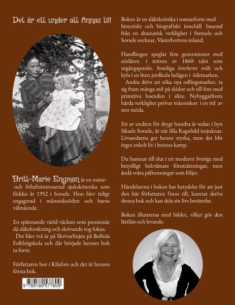 "Det är ett under att finnas till" är en släktkrönika i romanform med historiskt och biografiskt innehåll som baseras på en dramatisk verklighet i Stensele och Sorsele socknar i Västerbottens inland. Handlingen speglar livsöden från fem generationer med nödåren på 1860-talet som utgångspunkt. Somliga överlever svält och kyla i en liten jordkula belägen i ödemarken. Andra drivs att söka nya odlingsmarker, ta sig fram många mil på skidor och till fots med primitiva boenden i sikte. Nybyggarlivet blir en hård verklighet under enkla omständigheter där människor prövas och möts i en tid med stor möda, mod och framtidstro. Det sker många under och ett av miraklen för hundra år sedan i byn Siksele, Sorsele socken, är när lilla Ragnhild insjuknar. Livsandarna ger henne styrka, men det blir inget enkelt liv i hennes kamp. Du hamnar till slut i ett modernt Sverige med betydligt bekvämare förutsättningar, men ändå svåra påfrestningar som följer. Händelserna i boken har betydelse för att just den här författaren finns, kunnat skriva denna bok och kan dela sin livs berättelse. Boken har ett dokumentärt innehåll som illustreras med bilder vilket gör den lättläst och levande. I slutet av boken finns en släkttavla och karta.