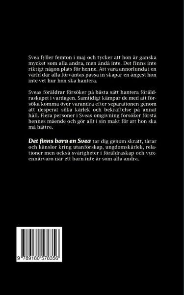 Svea fyller femton i maj och tycker att hon är ganska mycket som alla andra, men ändå inte. Det finns inte riktigt någon plats för henne. Att vara annorlunda i en värld där alla förväntas passa in skapar en ångest hon inte vet hur hon ska hantera. Sveas föräldrar försöker på bästa sätt hantera föräldraskapet i vardagen. Samtidigt kämpar de med att försöka komma över varandra efter separationen genom att desperat söka kärlek och bekräftelse på annat håll. Flera personer i Sveas omgivning försöker förstå hennes mående och gör allt i sin makt för att hon ska må bättre. Det finns bara en Svea tar dig genom skratt, tårar och känslor kring utanförskap, ungdomskärlek, relationer men också svårigheter i föräldraskap och vuxennärvaro när ett barn inte är som alla andra.