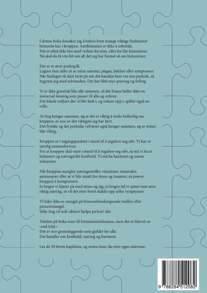 I denne boka forsøker jeg å belyse hvor mange viktige funksjoner histamin har i kroppen. Antihistamin er ikke å anbefale. Det er altså ikke bra med verken for mye, eller for lite histaminer. Nå skal du få vite litt om alt det jeg har funnet ut om histaminer. Det er et stort puslespill. Legene fant aldri ut av mine smerter, plager, lidelser eller symptomer. Når fastlegen til slutt lurte på om det kanskje bare var noe psykisk, så begynte jeg med selvstudier. Det har blitt mye prøving og feiling. Vi er ikke genetisk like alle sammen, så det finnes heller ikke en universal-løsning som passer til alle og enhver. Det lokale miljøet der vi blir født i, og vokser opp i, spiller også en rolle. At ting henger sammen, og at det er viktig å tenke helhetlig om kroppen, er noe av det viktigste jeg har lært. Det fysiske og det psykiske velværet også henger sammen, og er minst like viktig. Kroppen er i utgangspunktet i stand til å regulere seg selv. Vi har et utrolig immunforsvar. For at kroppen skal være i stand til å regulere seg selv, så må vi ha et balansert og næringsrikt kosthold. Vi må ha harmoni og sunne relasjoner. Når kroppen mangler næringsstoffer, vitaminer, mineraler, aminosyrer eller at vi blir utsatt for stress og traumer, så prøver kroppen å kompensere. Jo lengre vi kjører på med stress og jag, jo lengre tid vi spiser mat uten riktig næring, så vil det etter hvert dukke opp ulike symptomer. Vi lider ikke av mangel på betennelsesdempende midler, eller paracetmangel. Slike ting vil nok sikkert hjelpe på kort sikt. Tittelen på boka viser til histaminintoleranse, men det er likevel en «rød tråd.» Det er noe grunnleggende som gjelder for alle. Det handler om kosthold, næring og harmoni. Les de 10 første kapitlene, og resten leser du etter egen interesse.