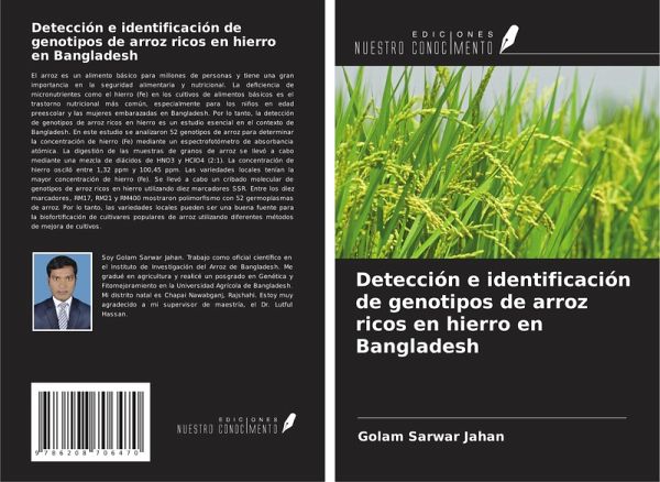 El arroz es un alimento básico para millones de personas y tiene una gran importancia en la seguridad alimentaria y nutricional. La deficiencia de micronutrientes como el hierro (Fe) en los cultivos de alimentos básicos es el trastorno nutricional más común, especialmente para los niños en edad preescolar y las mujeres embarazadas en Bangladesh. Por lo tanto, la detección de genotipos de arroz ricos en hierro es un estudio esencial en el contexto de Bangladesh. En este estudio se analizaron 52 genotipos de arroz para determinar la concentración de hierro (Fe) mediante un espectrofotómetro de absorbancia atómica. La digestión de las muestras de granos de arroz se llevó a cabo mediante una mezcla de diácidos de HNO3 y HClO4 (2:1). La concentración de hierro osciló entre 1,32 ppm y 100,45 ppm. Las variedades locales tenían la mayor concentración de hierro (Fe). Se llevó a cabo un cribado molecular de genotipos de arroz ricos en hierro utilizando diez marcadores SSR. Entre los diez marcadores, RM17, RM21 y RM400 mostraron polimorfismo con 52 germoplasmas de arroz. Por lo tanto, las variedades locales pueden ser una buena fuente para la biofortificación de cultivares populares de arroz utilizando diferentes métodos de mejora de cultivos.