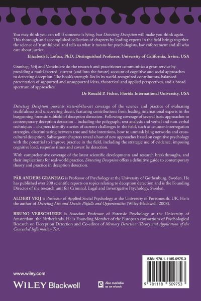 Detecting Deception: Current Challenges and Cognitive Approaches presents a state-of-the-art volume on the detection of deceit, with full coverage of the latest scientific developments in this area. This work connects research to problems of real-world practice, such as suspects' counter-interrogation strategies; how to unmak lying networks; and issues of cross-cultural deception. This is ideal for mental health and law enforcement professionals includign psychologists, psychiatrists, police, judges, lawyers, and security and intelligence officers, as well as students in these areas.
