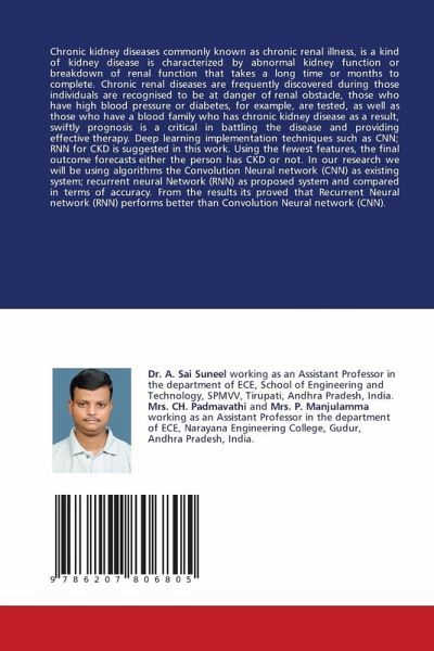 Chronic kidney diseases commonly known as chronic renal illness, is a kind of kidney disease is characterized by abnormal kidney function or breakdown of renal function that takes a long time or months to complete. Chronic renal diseases are frequently discovered during those individuals are recognised to be at danger of renal obstacle, those who have high blood pressure or diabetes, for example, are tested, as well as those who have a blood family who has chronic kidney disease as a result, swiftly prognosis is a critical in battling the disease and providing effective therapy. Deep learning implementation techniques such as CNN; RNN for CKD is suggested in this work. Using the fewest features, the final outcome forecasts either the person has CKD or not. In our research we will be using algorithms the Convolution Neural network (CNN) as existing system; recurrent neural Network (RNN) as proposed system and compared in terms of accuracy. From the results its proved that Recurrent Neural network (RNN) performs better than Convolution Neural network (CNN).