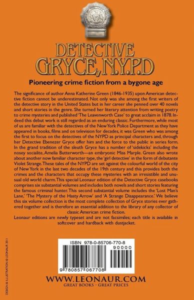 The significance of author Anna Katherine Green (1846-1935) upon American detective fiction cannot be underestimated. Not only was she among the first writers of the detective story in the United States but in her career she penned over 40 novels and short stories in the genre. She turned her literary attention from writing poetry to crime mysteries and published 'The Leavenworth Case' to great acclaim in 1878. Indeed this debut work is still regarded as an enduring classic. Furthermore, while most of us are familiar with the detectives of the New York Police Department as they have appeared in books, films and on television for decades, it was Green who was among the first to focus on the detectives of the NYPD as principal characters and, through her Detective Ebenezer Gryce offer him and the force to the public in series form. In the grand tradition of the sleuth Gryce has a number of 'sidekicks' including the nosey socialite, Amelia Butterworth-an embryonic Miss Marple. Green also wrote about another now familiar character type, the 'girl detective' in the form of debutante Violet Strange. These tales of the NYPD are set against the colourful world of the city of New York in the last two decades of the 19th century and this provides both the crimes and the characters that occupy these mysteries with an irresistible and unusual old world charm. This special Leonaur edition of the Detective Gryce casebooks comprises six substantial volumes and includes both novels and short stories featuring the famous criminal hunter. This second substantial volume includes the 'Lost Man's Lane,' 'The Mystery of the Hasty Arrow' and 'A Strange Disappearance.' We believe this six volume collection is the most complete collection of Gryce stories ever gathered together and is therefore an essential addition to the library of any collector of classic American crime fiction. Leonaur editions are newly typeset and are not facsimiles; each title is available in softcover and hardback with dustjacket.