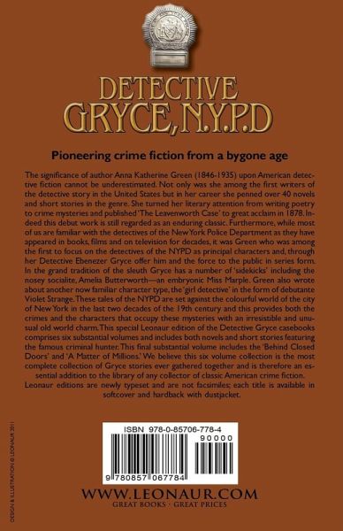 The significance of author Anna Katherine Green (1846-1935) upon American detective fiction cannot be underestimated. Not only was she among the first writers of the detective story in the United States but in her career she penned over 40 novels and short stories in the genre. She turned her literary attention from writing poetry to crime mysteries and published 'The Leavenworth Case' to great acclaim in 1878. Indeed this debut work is still regarded as an enduring classic. Furthermore, while most of us are familiar with the detectives of the New York Police Department as they have appeared in books, films and on television for decades, it was Green who was among the first to focus on the detectives of the NYPD as principal characters and, through her Detective Ebenezer Gryce offer him and the force to the public in series form. In the grand tradition of the sleuth Gryce has a number of 'sidekicks' including the nosey socialite, Amelia Butterworth-an embryonic Miss Marple. Green also wrote about another now familiar character type, the 'girl detective' in the form of debutante Violet Strange. These tales of the NYPD are set against the colourful world of the city of New York in the last two decades of the 19th century and this provides both the crimes and the characters that occupy these mysteries with an irresistible and unusual old world charm. This special Leonaur edition of the Detective Gryce casebooks comprises six substantial volumes and includes both novels and short stories featuring the famous criminal hunter. This final substantial volume includes the 'Behind Closed Doors' and 'A Matter of Millions.' We believe this six volume collection is the most complete collection of Gryce stories ever gathered together and is therefore an essential addition to the library of any collector of classic American crime fiction. Leonaur editions are newly typeset and are not facsimiles; each title is available in softcover and hardback with dustjacket.