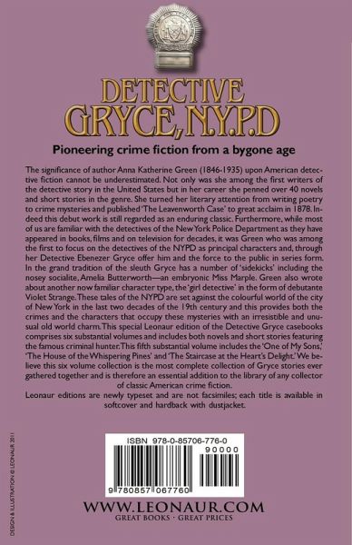 The significance of author Anna Katherine Green (1846-1935) upon American detective fiction cannot be underestimated. Not only was she among the first writers of the detective story in the United States but in her career she penned over 40 novels and short stories in the genre. She turned her literary attention from writing poetry to crime mysteries and published 'The Leavenworth Case' to great acclaim in 1878. Indeed this debut work is still regarded as an enduring classic. Furthermore, while most of us are familiar with the detectives of the New York Police Department as they have appeared in books, films and on television for decades, it was Green who was among the first to focus on the detectives of the NYPD as principal characters and, through her Detective Ebenezer Gryce offer him and the force to the public in series form. In the grand tradition of the sleuth Gryce has a number of 'sidekicks' including the nosey socialite, Amelia Butterworth-an embryonic Miss Marple. Green also wrote about another now familiar character type, the 'girl detective' in the form of debutante Violet Strange. These tales of the NYPD are set against the colourful world of the city of New York in the last two decades of the 19th century and this provides both the crimes and the characters that occupy these mysteries with an irresistible and unusual old world charm. This special Leonaur edition of the Detective Gryce casebooks comprises six substantial volumes and includes both novels and short stories featuring the famous criminal hunter. This fifth substantial volume includes the 'One of My Sons,' 'The House of the Whispering Pines' and 'The Staircase at the Heart's Delight.' We believe this six volume collection is the most complete collection of Gryce stories ever gathered together and is therefore an essential addition to the library of any collector of classic American crime fiction. Leonaur editions are newly typeset and are not facsimiles; each title is available in softcover and hardback with dustjacket.