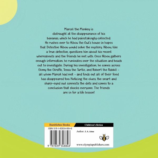 Marcel the Monkey is distraught at the disappearance of his bananas, which he had painstakingly collected. He rushes over to Hibou the Owl's house in hopes that Detective Hibou would solve the mystery. Hibou, like a true detective, questions him about his recent whereabouts and the friends he met with. Once Hibou gathers enough information, he ruminates over the situation and heads out to investigate. During his investigation, he comes across Ginny the Giraffe, Tessa the Turtle, and Robert the Rabbit - all whom Marcel had met - and finds out all of their food has disappeared too. Noticing the clues, the smart and sharp-eyed owl connects the dots and comes to a conclusion that shocks everyone. The friends are in for a life lesson!