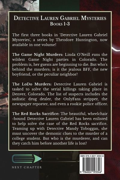 The first three books in 'Detective Lauren Gabriel Mysteries', a series by Theodore Huntington, now available in one volume! The Game Night Murders: Linda O'Neill runs the wildest Game Night parties in Colorado. The problem is, her guests are beginning to die. But who's behind the murders; is it the jealous BFF, the new boyfriend, or the peculiar neighbor? The LoDo Murders: Detective Lauren Gabriel is tasked to solve the serial killings taking place in Denver, Colorado. The list of suspects includes the sadistic drug dealer, the OnlyFans stripper, the newspaper reporter, and even a rookie police officer. The Red Rocks Sacrifice: The beautiful, wheelchair-bound Detective Lauren Gabriel has been enlisted to help solve the case of the Red Rocks sacrifice. Teaming up with Detective Mandy Toboggan, she must uncover the demonic clues to the murder of a college student. But who is the murderer, and can they catch him before another life is lost?