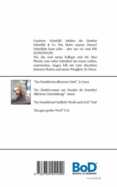 Gestatten: Schnüffel. Inhaber der Detektei Schnüffel & Co. Sicher, zuverlässig und schnell.Das Motto unseres Hauses? Schnüffeln kann jeder. Aber nur wir sind DIE SCHNÜFFLER!Wir, das sind meine Kollegin und ich: Miss Phoebe, eine wahre Schönheit mit einem weißen, samtweichen, langen Fell mit Latte Macchiato farbenen Flecken und meine Wenigkeit, Sir Henry, genannt Schnüffel, Dr. Schnüffel.Wir arbeiten seit nunmehr zwei Jahren zusammen, und ich kann ohne Einschränkungen sagen: Wir sind ein Dreamteam!
