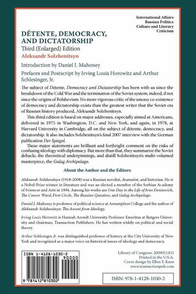 The subject of Detente, Democracy and Dictatorship has been with us since the breakdown of the Cold War and the termination of the Soviet system, indeed, if not since the origins of Bolshevism. No more vigorous critic of the uneasy co-existence of democracy and dictatorship exists than the greatest writer that the Soviet era of Russian history produced, Aleksandr Solzhenitsyn. This third edition is based on major addresses, especially aimed at Americans, delivered in 1975 in Washington, D.C. and New York, and again, in 1978, at Harvard University in Cambridge, all on the subject of detente, democracy and dictatorship. It also includes Solzhenitsyn's final 2007 interview with the German publication Der Spiegel. These major statements are brilliant and forthright comment on the risks of confusing ideology with diplomacy. But more than that, they summarize the Soviet debacle, the theoretical underpinnings, and distill Solzhenitsyn's multi-volumed masterpiece, the Gulag Archipelago.