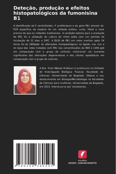 A identificação de F. verticillioides, F. proliferatum e do gene FB1 através da PCR específica da espécie foi um método prático, curto, fiável e mais preciso do que os métodos tradicionais. A condição óptima para a produção de FB1 foi a utilização de cultura de milho patty com um período de incubação de 21 dias a 20ºC. A DL50 de FB1 em ratos machos após 24 horas foi de 1800ppb. As alterações histopatológicas no fígado, nos rins e no baço dos ratos tratados com FB1 nas concentrações de 800 e 1200 ppb em comparação com o grupo de controlo, mostraram um aumento significativo das alterações degenerativas e das células apoptóticas em comparação com o grupo de controlo.