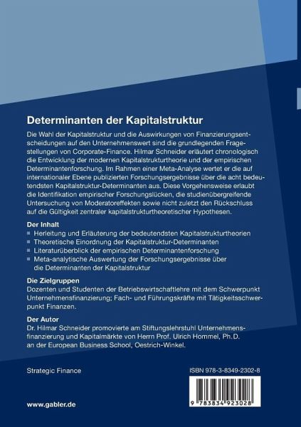Die Wahl der Kapitalstruktur und die Auswirkungen von Finanzierungsentscheidungen auf den Unternehmenswert sind die grundlegenden Fragestellungen von Corporate-Finance. Hilmar Schneider erläutert chronologisch die Entwicklung der modernen Kapitalstrukturtheorie und der empirischen Determinantenforschung. Im Rahmen einer Meta-Analyse wertet er die auf internationaler Ebene publizierten Forschungsergebnisse über die acht bedeutendsten Kapitalstruktur-Determinanten aus. Diese Vorgehensweise erlaubt die Identifikation empirischer Forschungslücken, die studienübergreifende Untersuchung von Moderatoreffekten sowie nicht zuletzt den Rückschluss auf die Gültigkeit zentraler kapitalstrukturtheoretischer Hypothesen.