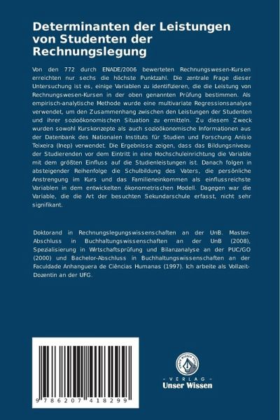 Von den 772 durch ENADE/2006 bewerteten Rechnungswesen-Kursen erreichten nur sechs die höchste Punktzahl. Die zentrale Frage dieser Untersuchung ist es, einige Variablen zu identifizieren, die die Leistung von Rechnungswesen-Kursen in der oben genannten Prüfung bestimmen. Als empirisch-analytische Methode wurde eine multivariate Regressionsanalyse verwendet, um den Zusammenhang zwischen den Leistungen der Studenten und ihrer sozioökonomischen Situation zu ermitteln. Zu diesem Zweck wurden sowohl Kurskonzepte als auch sozioökonomische Informationen aus der Datenbank des Nationalen Instituts für Studien und Forschung Anísio Teixeira (Inep) verwendet. Die Ergebnisse zeigen, dass das Bildungsniveau der Studierenden vor dem Eintritt in eine Hochschuleinrichtung die Variable mit dem größten Einfluss auf die Studienleistungen ist. Danach folgen in absteigender Reihenfolge die Schulbildung des Vaters, die persönliche Anstrengung im Kurs und das Familieneinkommen als einflussreichste Variablen in dem entwickelten ökonometrischen Modell. Dagegen war die Variable, die die Art der besuchten Sekundarschule erfasst, nicht sehr signifikant.