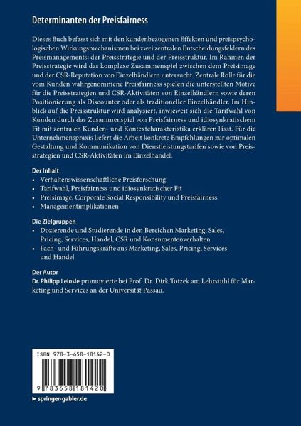 Dieses Buch befasst sich mit den kundenbezogenen Effekten und preispsychologischen Wirkungsmechanismen bei zwei zentralen Entscheidungsfeldern des Preismanagements: der Preisstrategie und der Preisstruktur. Im Rahmen der Preisstrategie wird das komplexe Zusammenspiel zwischen dem Preisimage und der CSR-Reputation von Einzelhändlern untersucht. Zentrale Rolle für die vom Kunden wahrgenommene Preisfairness spielen die unterstellten Motive für die Preisstrategien und CSR-Aktivitäten von Einzelhändlern sowie deren Positionierung als Discounter oder als traditioneller Einzelhändler. Im Hinblick auf die Preisstruktur wird analysiert, inwieweit sich die Tarifwahl von Kunden durch das Zusammenspiel von Preisfairness und idiosynkratischem Fit mit zentralen Kunden- und Kontextcharakteristika erklären lässt. Für die Unternehmenspraxis liefert die Arbeit konkrete Empfehlungen zur optimalen Gestaltung und Kommunikation von Dienstleistungstarifen sowie von Preisstrategien und CSR-Aktivitäten im Einzelhandel.