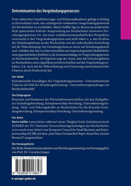 Auf Grundlage aktueller Forschungsarbeiten zur Identifikation unternehmerischer Chancen und etablierter Theorien zur Gründungsabsicht wird eine neue Perspektive des Vorgründungsprozesses erarbeitet. Es erfolgt eine intensive Aufarbeitung des Literaturstandes zu unternehmerischen Chancen und zum absichtsbasierten Vorgründungsprozess. Aufbauend auf der entwickelten Perspektive wird ein neues Modell des Vorgründungsprozesses abgeleitet und empirisch getestet. Hierdurch offenbaren sich bisher verborgene Wirkungszusammenhänge im Vorgründungsprozess. Auf dieserGrundlage werden anschließend Chancen und Grenzen der Einflussnahme von Hochschulen auf den Vorgründungsprozess bei Studierenden untersucht. Dabei wird das Gründungsklima an Hochschulen als psychologisches Konstrukt in die wissenschaftliche Diskussion eingeführt. Im Ergebnis zeigt sich das Gründungsklima an Hochschulen als einflussreicher Faktor bei der Ausbildung der psychologischen Grundlagendes Vorgründungsprozesses und bei der Übersetzung ausgebildeterGründungsabsichten in beobachtbares Verhalten. Letztendlich geben dieErgebnisse wichtige Implikationen für die Unterstützung akademischerUnternehmensgründungen in den frühen Phasen des Vorgründungsprozesses. Ebenso wird dem Hochschulmanagement ein geeignetes Messinstrument an die Hand gegeben, um die wahrgenommene Gründungsfreundlichkeit der Institution zu erheben.