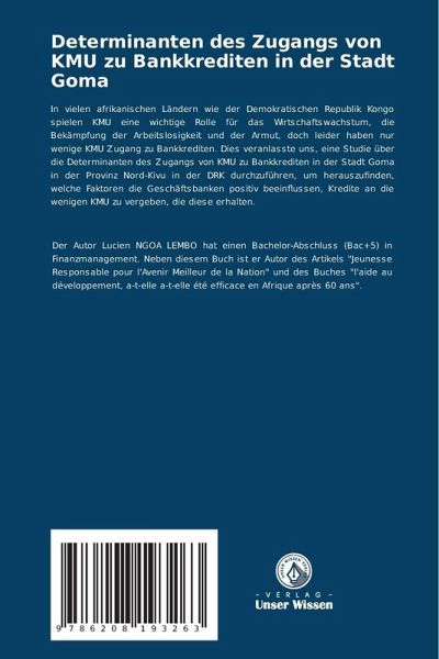 In vielen afrikanischen Ländern wie der Demokratischen Republik Kongo spielen KMU eine wichtige Rolle für das Wirtschaftswachstum, die Bekämpfung der Arbeitslosigkeit und der Armut, doch leider haben nur wenige KMU Zugang zu Bankkrediten. Dies veranlasste uns, eine Studie über die Determinanten des Zugangs von KMU zu Bankkrediten in der Stadt Goma in der Provinz Nord-Kivu in der DRK durchzuführen, um herauszufinden, welche Faktoren die Geschäftsbanken positiv beeinflussen, Kredite an die wenigen KMU zu vergeben, die diese erhalten.