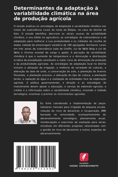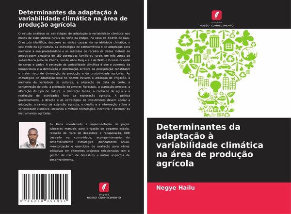 O estudo analisou as estratégias de adaptação à variabilidade climática nos meios de subsistência rurais do norte da Etiópia, no caso do distrito de Kalu. O estudo identifica, descreve as várias causas da variabilidade climática, o seu efeito na agricultura, as estratégias de sobrevivência e de adaptação para melhorar a sua produtividade e os métodos de recolha de dados método de amostragem aleatória de 180 agregados familiares rurais em três zonas de subsistência (vale de Cheffa, sul de Wollo Belg e sul de Wollo e Oromia oriental de sorgo e gado). A perceção da variabilidade climática é que o aumento da temperatura e a diminuição e distribuição errática da precipitação constituem o maior risco de diminuição da produção e da produtividade agrícolas. As estratégias de adaptação local no distrito incluem a utilização de irrigação, a melhoria da variedade de culturas, a alteração da data de corte, a conservação do solo, a plantação de árvores florestais, a plantação precoce, a alteração do tipo de cultura, a plantação tardia, a captação de água e a realização de actividades fora da exploração agrícola. A política governamental, a direção e as estratégias de investimento devem apoiar a educação, o serviço de extensão agrícola, o crédito e a informação sobre a variabilidade climática, incluindo o método tecnológico, incentivar e premiar os instrumentos agrícolas.