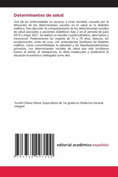 Uno de las enfermedades en ascenso a nivel mundial, causada por la alteración de los determinantes sociales en la salud es la diabetes mellitus. Para describir el comportamiento de los determinantes sociales de salud asociados a pacientes diabéticos tipo 2 en el período de julio 2019 a mayo 2021. Se realizó un estudio cuanticualitativo, descriptivo y transversal. Predominaron las mujeres de 75 a 79 años, blancas, sin escolarización, amas de casa, con antecedentes familiares de diabetes mellitus, como comorbilidades la obesidad y las hiperlipoproteinemias primarias. Los determinantes sociales de salud que más incidieron fueron el estrés, el tabaquismo, la dieta inadecuada y predominó la situación económica catalogada como alta.